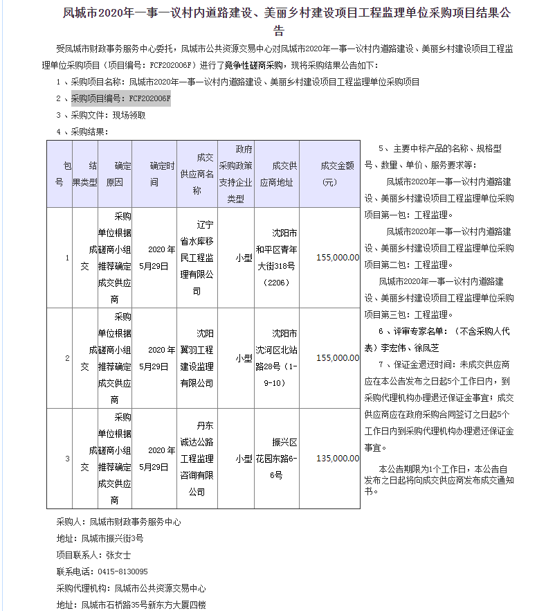 遼寧省水庫移民公司中標鳳城市2020年一事一議村內道路建設、美麗鄉(xiāng)村建設項目工程監(jiān)理...