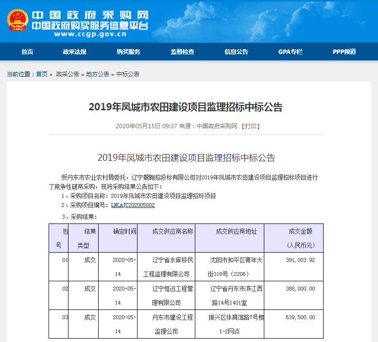 遼寧省水庫移民公司中標2019年鳳城市農田建設項目監(jiān)理01包