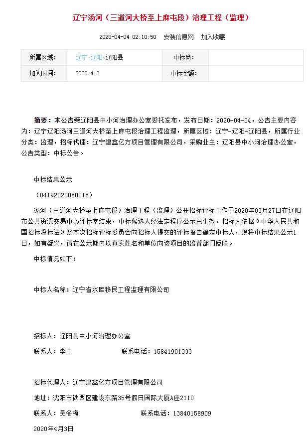 遼寧省水庫移民公司中標遼寧湯河(三道河大橋至上麻屯段)治理工程(監(jiān)理)...